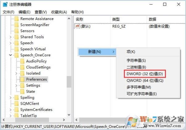 2、在左侧依次展开:HKEY_CURRENT_USER\SOFTWARE\Microsoft\Speech_OneCore\Preferences ,在右侧空白单击右键,选择【新建】-【DWORD(32位)值】,将该值命名为VoiceActivationEnableAboveLockscreen的,将其值设置为【1】即可。