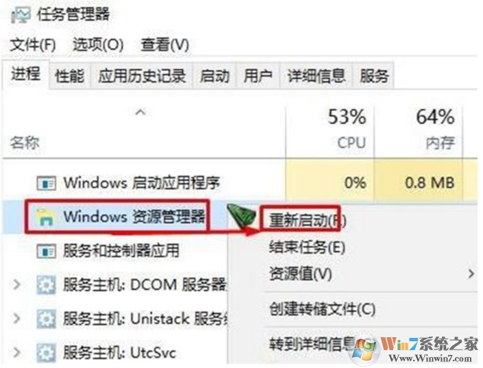 2、在任务管理器【进程】选卡下找到【Windows 资源管理器】,单击右键,选择【重新启动】即可。