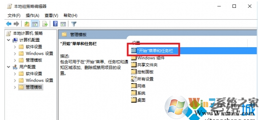 2、在本地组策略管理器中,依次展开“用户配置”——“管理模版”——“开始菜单和任务栏”。