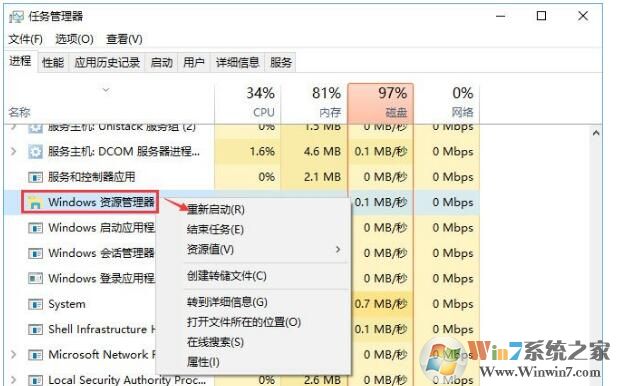 2、在“Windows 资源管理器”上单击鼠标右键,选择“重新启动”即可;
