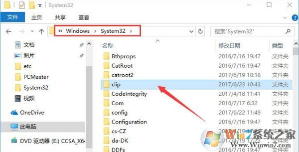 3、如果重启资源管理器问题依旧,打开此电脑,依次打开C:\Windows\System32,在该文件夹查找是否有“clip”文件夹,若没有则新建一个文件夹命名为:clip 即可。