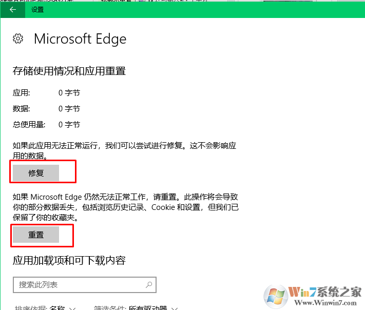 4、先选择修复,如修复无效我们再选择重置edge浏览器。