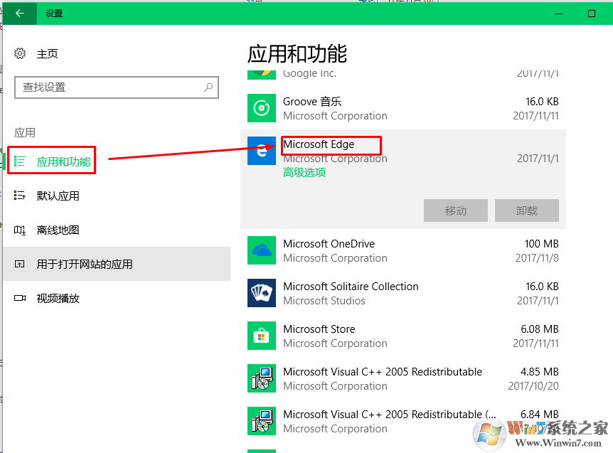 3、在应用和功能中找到edge浏览器单击选择高级选项。