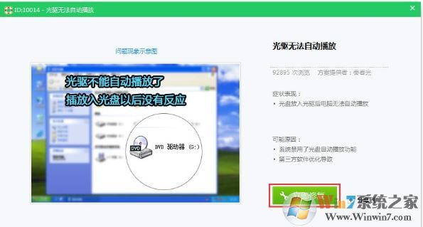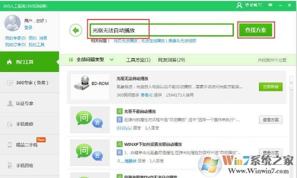 2、在上方查找方案的搜索框中输入“光驱无法自动播放”,搜索问题的解决方案;