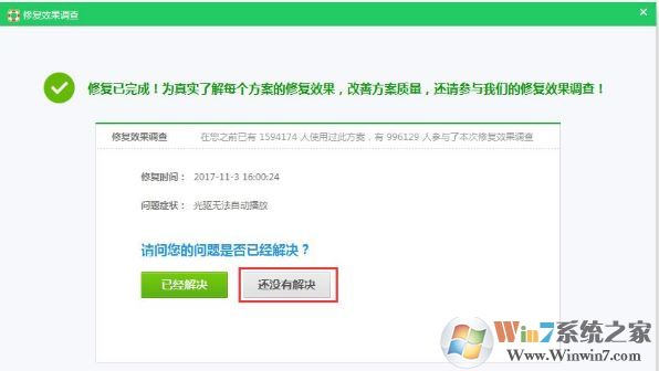 5、修复已完成,光驱运行正常,如果仍然没有解决你的问题,可以点击“还没有解决”字样查找其他解决方案即可。