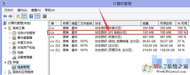 右键“这台电脑”(我的电脑) - 管理 - 存储 - 磁盘管理,打开后查看右边是否有EFI系统分区,如下图所示: