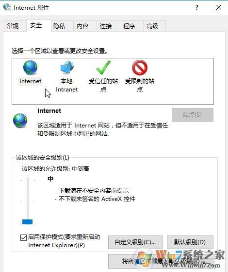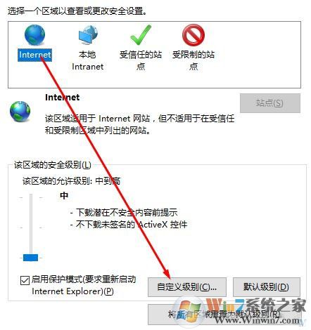 3、选择“安全”页面,点击“Internet”,再选择下面的“自定义级别”按钮,如图: