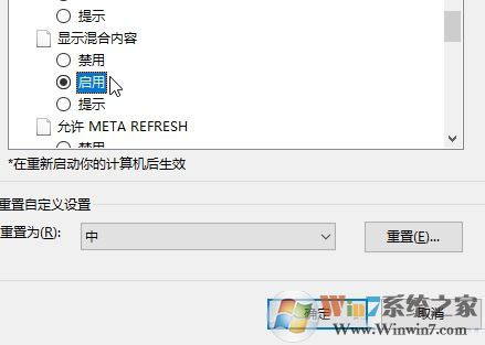 3、首先将重置为 下拉菜单选择“中”,然后在上面框中往下拉,找到中间偏下的,将“显示混合内容”项缺省的“提示”改成“启用”,问题即可解决。