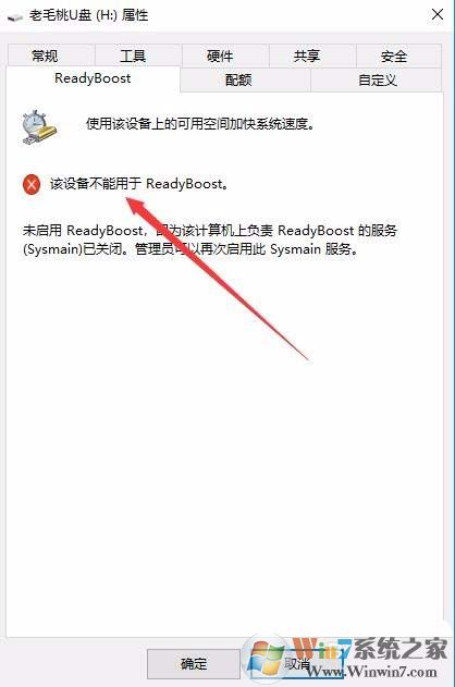 1、在使用U盘启用ReadyBoost服务的时候,提示“该设备不能用于ReadyBoost”,我们点击确定按钮。