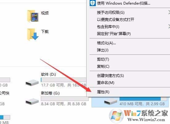7、我们再右键点击U盘,然后在弹出菜单中点击“属性”菜单项
