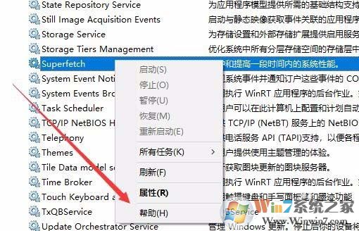 4、这时会打开服务窗口,在服务列表中找到Superfetch服务项,右键点击该服务项,在弹出菜单中点击“属性”菜单项