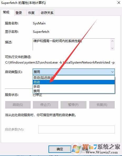 5、在打开的属性窗口中点击启动类型下拉菜单,在弹出菜单中选择“自动”菜单项