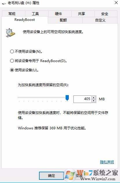 8、在打开的U盘属性窗口中,点击ReadyBoost标签,现在可以看到ReadyBoost可以启用了。