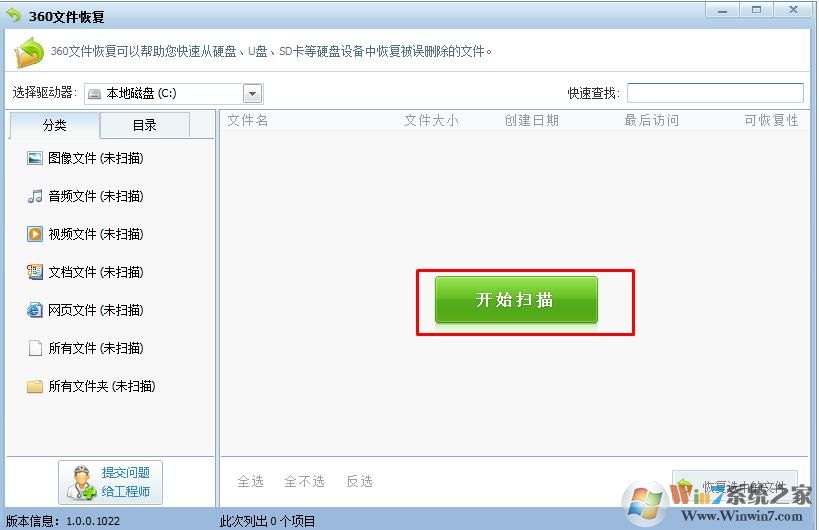 3、安装后自动打开360文件恢复工具,选择要扫描的磁盘,然后点击开始扫描;www.xiuchufang.com