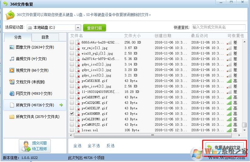 4、扫描之后,找找有没有你的文件夹,有的话,勾选,然后点击“恢复选所文件”;(右侧会显示可恢复性,绿色为可恢复度高)