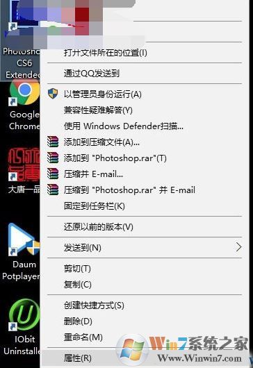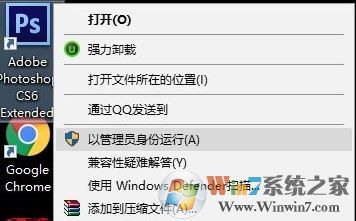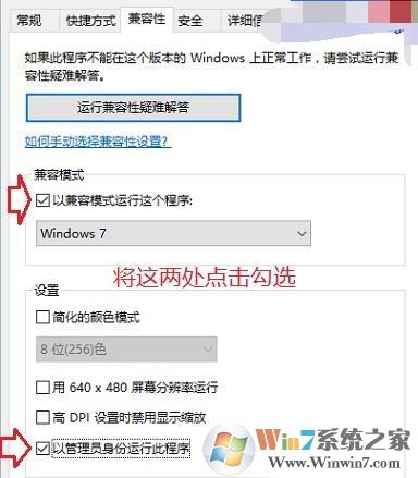 3、在PS属性对话框,点击切换到“兼容性”选项卡,点击勾选“以兼容模式运行这个程序”(建议选择Windows 7),接着在下面的设置栏中勾选“以管理员身份运行此程序”再点击确认(这个一定要勾选,不然还有可能出现配置错误)。,点击“确定”按钮保存设置即可。