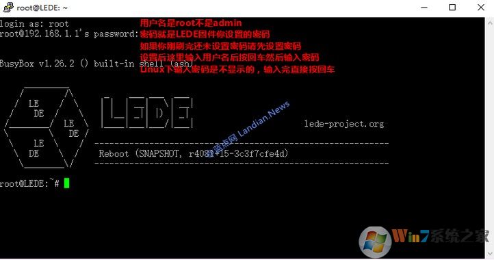 在此特别提示用户名是root,密码是初次登陆LEDE固件设置的密码、输入密码是不显示的输入完成直接回车;