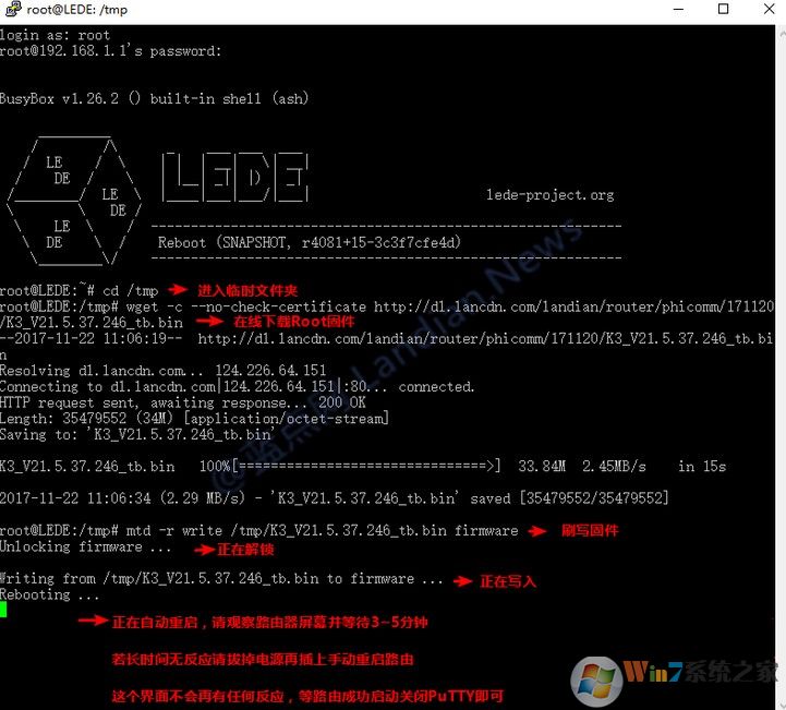 4、当SSH连接成功后即可在线下载Root固件先将路由刷回Root固件,刷回Root固件后即可再刷回官版固件;