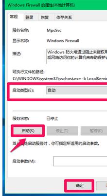 步骤三:在进入“Windows Firewall 属性”的时候,我们需要在打开的Windows Firewall 属性窗口,找到“启动类型”,点击“启动”,(启动类型默认为:自动 ),再点击:确定;