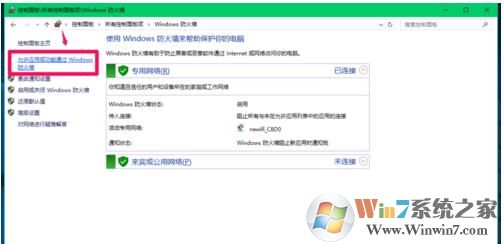 步骤二:在进入Windows防火墙窗口时,会发现窗口左侧的“允许应用或功能通过Windows防火墙”并点击;