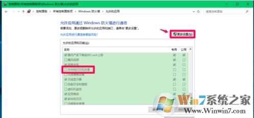 步骤三:在进入允许的应用窗口后,我们找到“文件和打印机共享”,如果文件和打印机共享为不可点击状态,则点击右上角的“更改设置”;