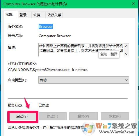 第三步:最后我们需要启动Windows10系统的Computer Browser服务。