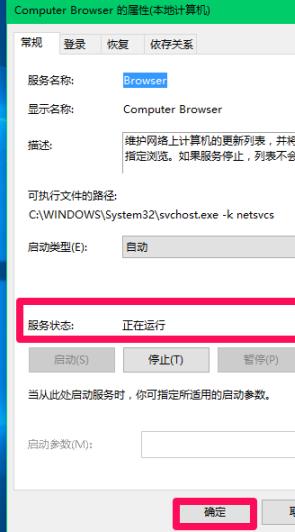 步骤三:我们需要在等待2分钟左右,看看Computer Browser的服务状态是否保持为:正在运行?如果能保持正在运行,点击:确定;