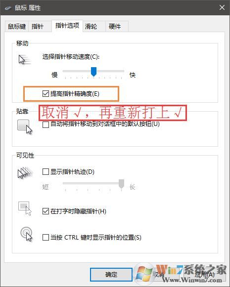 5、将下面 提高指针精确度的勾去掉,点击 应用,然后重新勾选 该选项,点击应用确定;