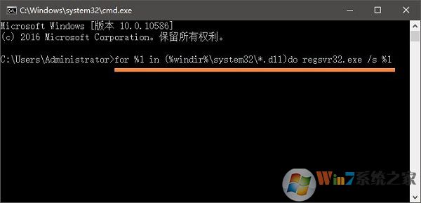 2、在命令提示符中输入:for %1 in (%windir%\system32\*.dll)do regsvr32.exe /s %1 按下回车键;如图所示: