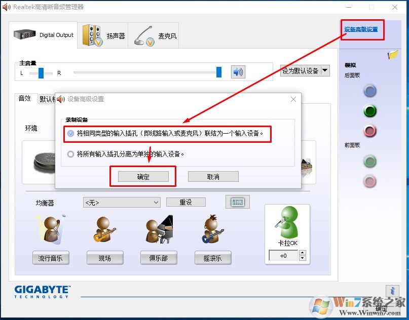 2、打开高级设置,将相同类型的输入插孔归类为同一设备勾选,这样在插入耳机的情况下就会优先播放耳机了。