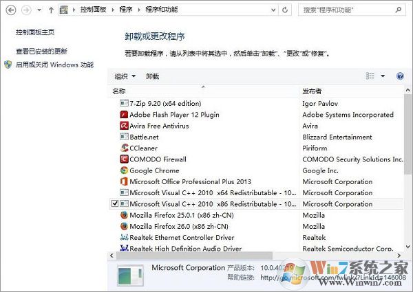 1、将鼠标移到屏幕左下角点击右键或者同时按下Windows徽标键+X键,调出超级菜单,点击“程序和功能”,如下图: