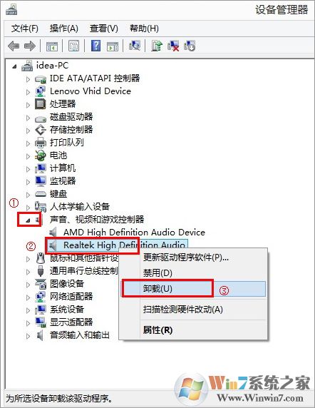 2、在设备管理器界面,展开“声音、视频和游戏控制器”,在“Realtek High Definition Audio”上点击鼠标右键,选择”卸载”,如图所示: