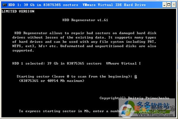 5、出现一个DOS画面,要求你在闪烁的横线处输入数字,可以默认为0直接回车扫描,如果知道坏道的字节处,也可以输入有坏道的数值,再回车。这里我选择默认0,代表重0字节开始扫描