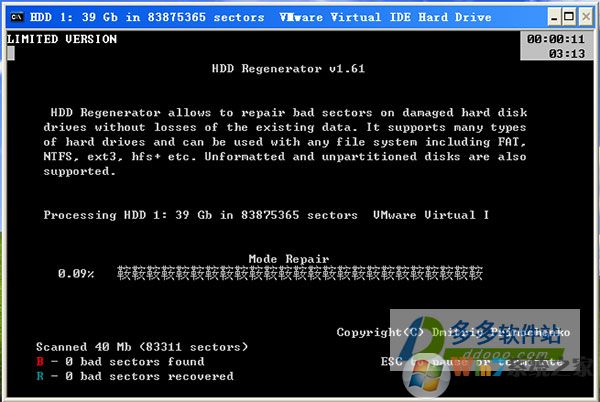 6、程序自动扫描你选择的硬盘,不用去管,当HDD扫描到坏道后会在进度条上显示红色的“B”字,随后就开始自动修复,修复好的用蓝色的“R”字标注。扫描并修复完后就可以正常的是使用硬盘了