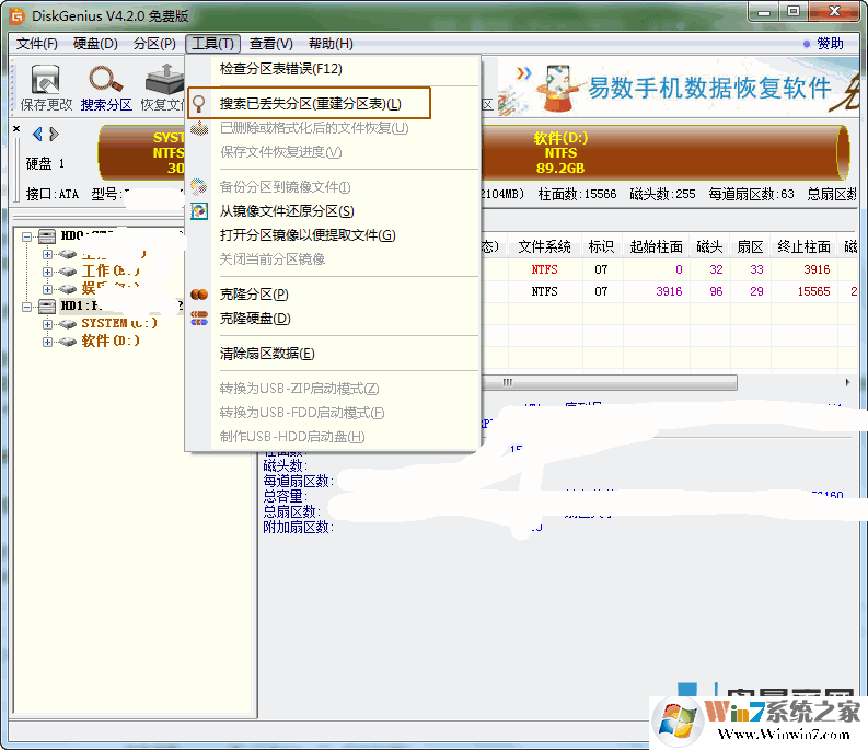 3、然后点击菜单栏的“工具(T)”,继续点“搜索已丢失分区(重建分区表)”,如下图