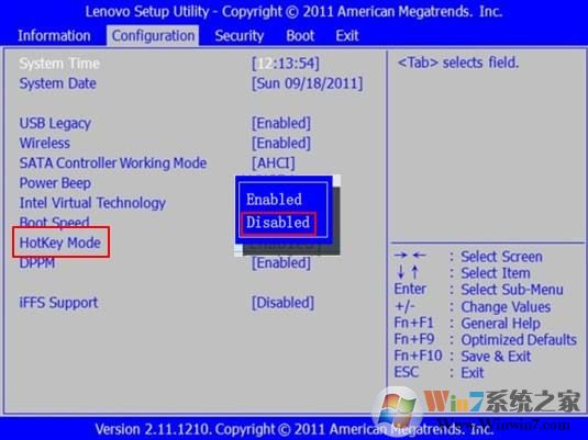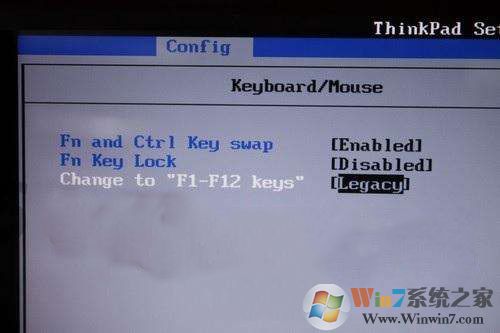 3、然后在bios中依次打开 CONFIG -- Keyboard/Mouse -- Change to "f1-f12 key或Hotkey Mode 设置为Legacy兼容模式或D开头的disabled 字样即可。