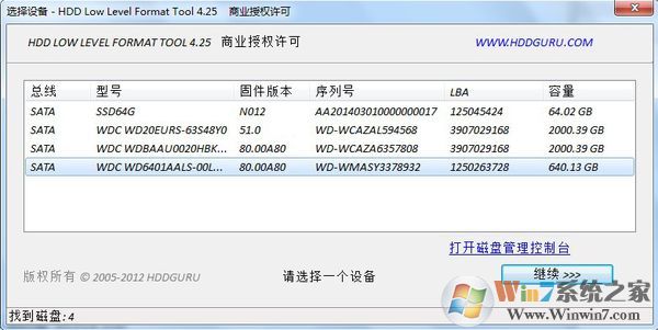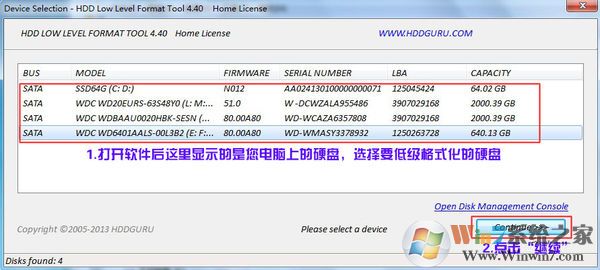 1、打开低格工具后,我们选择硬盘~(当然如果电脑中只有一个硬盘是不能操作的,我们需要选择要低格的外挂硬盘)