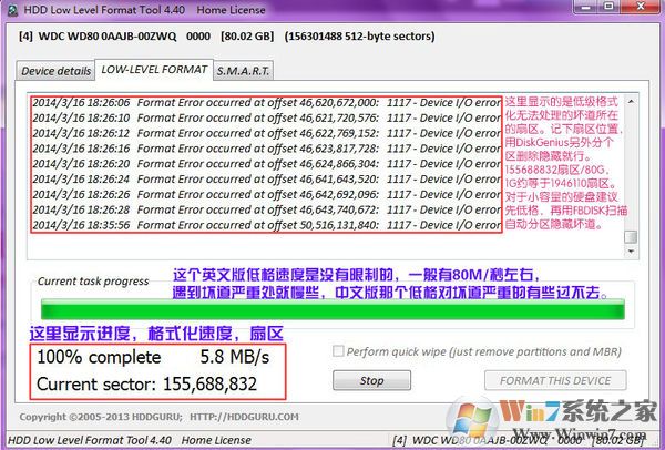 注:执行低格操作后,磁盘中的所有数据将丢失,且不可以恢复数据(会很难恢复)。在硬盘出现坏道时,低格可以在一定程序上屏蔽坏道,当有病毒入侵到硬盘扇区中时,使用普通的格式化很难清理掉,这时只有使用低级格式化来彻底重建硬盘扇区,让硬盘恢复正常的功能。