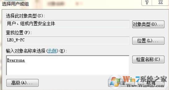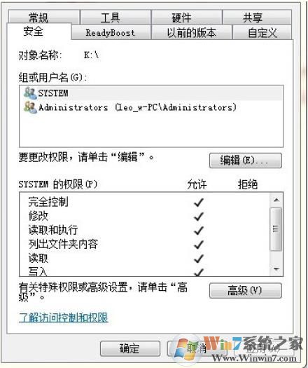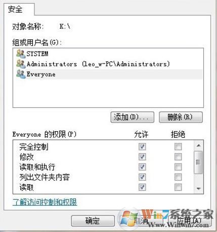 方案 2)右键点击出错的移动硬盘,点击“属性”,点击“安全”选项卡,看“组和用户名”中是否有“Everyone”这个组;如果没有(如下图),点击“编辑”>>“添加”,在“输入对象名称来选择”下方键入“everyone”,点击“检查名称”。待“组和用户名”中出现“Everyone”后,如下图点击“确定”。