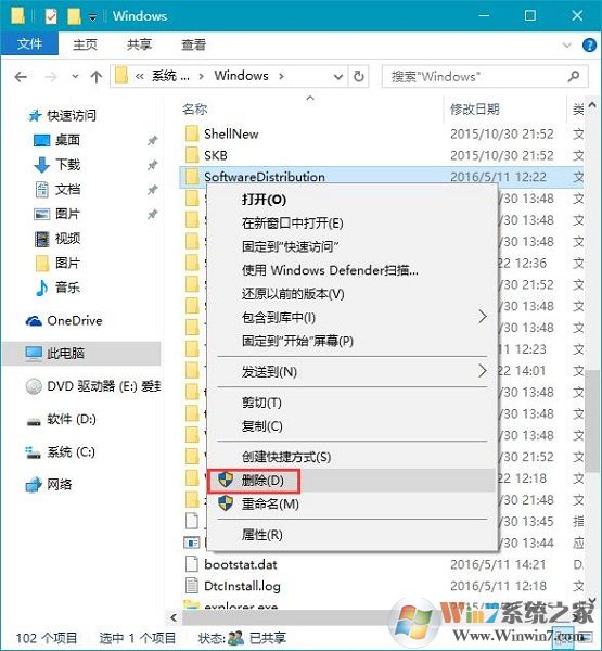 3、C:\windows\,找到SoftwareDistribution文件夹,将该文件夹删除;