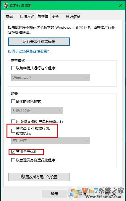 6、切换到兼容性选项卡,将下图中红框内的2项勾选确定即可,