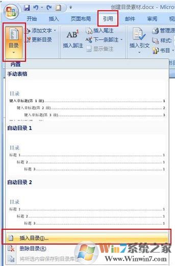 1、打开word2007点击“引用”-“目录”按钮,在弹出的下拉列表中选择“插入目录”命令。提示:根据需求也可以选择“自动目录1”或“自动目录2”,如图: