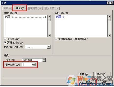 2、此时会弹出“目录”框,我们在目录选卡下的常规中将“显示级别”设置为 1 点击【确定】;