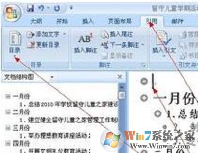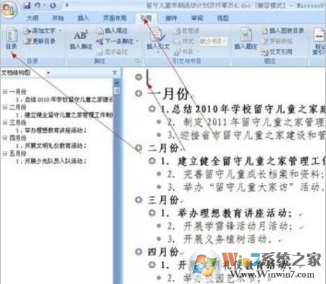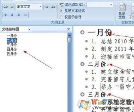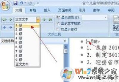 2、把光标停留在一级目录的前方,点击左上方的一级目录,www.w10zj.com例:把一月份、二月份、三月份。。。。。。等作为一级目录;