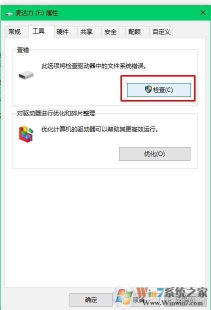 2、切换到【工具】选卡, 在差错下点击【检查】,然后点击【扫描驱动器】来检测修复;