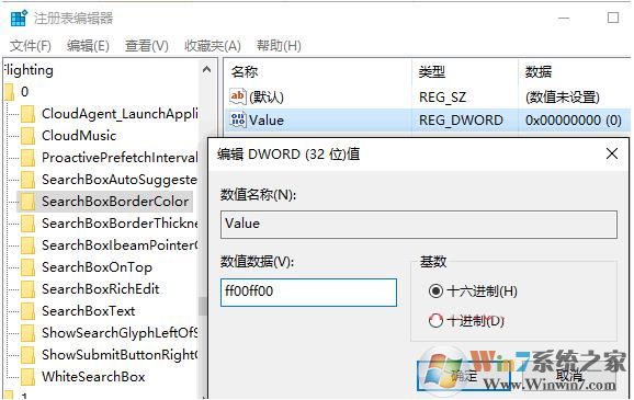 然后为边框设置颜色。继续定位至:HKEY_CURRENT_USER\Software\Microsoft\Windows\CurrentVersion\Search\Flighting\0\SearchBoxBorderColor