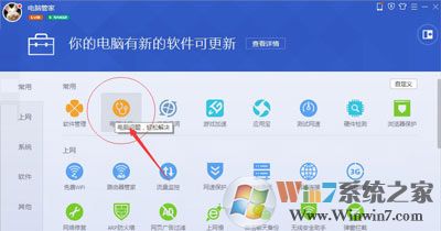 2、打开电脑管家选择工具箱,然后在第一行位置可以看到一个叫做电脑诊所的图标。