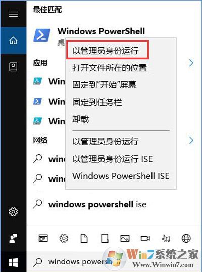 2、在Cortana搜索框输入windows powershell,鼠标右击windows powershell以管理员运行,复制粘贴以下命令运行。