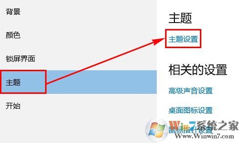 2、在打开的“设置”窗口中,选择左侧的“主题”选项,右侧点击“主题设置”,如下图所示: