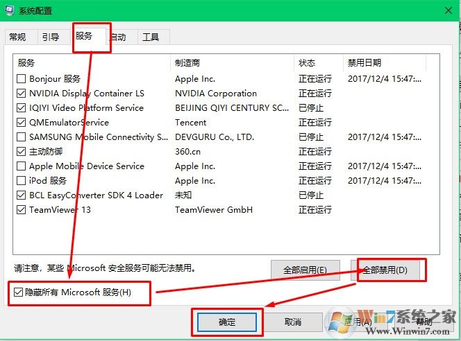 六、切换到服务选项卡下,选择隐藏所有micrisoft服务,然后点击全部禁用---确定。